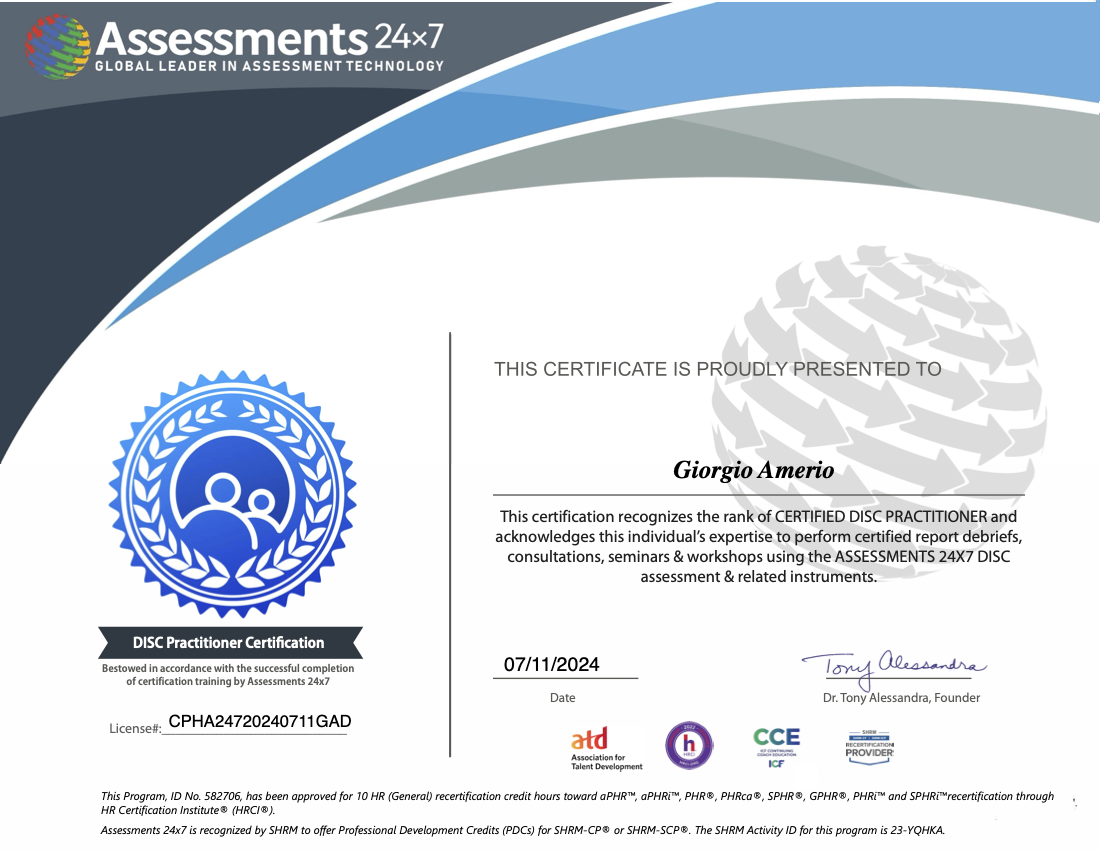 “DISC – Comunicare e relazionarsi” è un corso che mostra un modo di orientarsi nelle relazioni e nella comprensione di noi stessi e degli altri con un taglio molto pragmatico. I riferimenti presentati permettono di fare propri tutti i concetti affrontati e rendono questo momento di formazione fruibile anche nel proprio quotidiano, lasciando ottimi spunti di riflessione. Giorgio Amerio conduce la formazione con tono e metodo incisivi e accattivanti, alternando sapientemente l’illustrazione dei punti cardine del DISC a momenti pratici in cui ricondurli alla propria sfera personale.